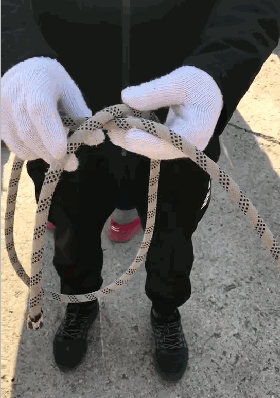 2. 卷結。卷結在民間又叫豬蹄扣,可以很好的用于固定。先搭在要固定的物體上,分出一邊長,一邊略短,然后交叉纏繞一圈,從交叉處穿出再打一個半結即可固定,并會越掙越緊。