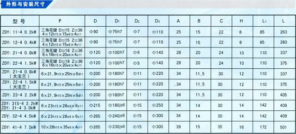 ZDY系列錐形轉子三相異步電動機,起動平穩,制動安全,且能與減速機配套,用于驅動起重機械及**率機械和其它需要制動平緩的傳動機械。 ZDY系列電動機采用380V電源,50Hz,基本工作制為S4,負載持續率25%,等效起動次數120次/小時。 ZDY系列電動機為封閉式結構,防護等級有IP44和IP54,冷卻方式為自冷式IC0141.絕緣等級有B級和F級兩種: